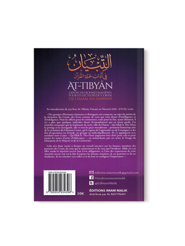 At-Tibyân fi Adâb Hamalat al-Qur'ân (L'Exposé des Bonnes Manières pour les Porteurs du Coran) est un ouvrage écrit par l'imam An-Nawawî (636-676 H).Ce livre met en lumière l'éthique et les comportements appropriés pour ceux qui récitent, mémorisent ou enseignent le Coran, soulignant l'importance de l'intention sincère et du respect envers le Livre sacré.