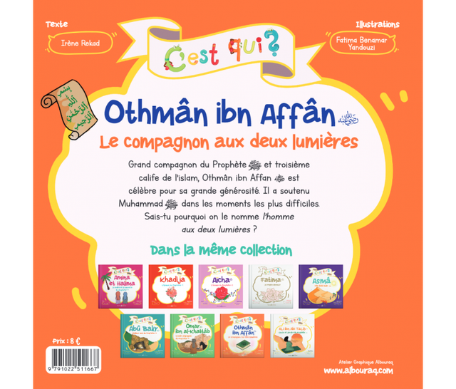 Ce livre raconte la vie de Othmân ibn Affân, le troisième calife de l’Islam, surnommé "le compagnon aux deux lumières" en raison de ses vertus et de son rôle dans la préservation du Coran. À travers un récit simple et inspirant, l’auteur Irène Rekad met en lumière l’histoire de ce complice de foi, généreux et dévoué, qui a laissé un héritage précieux dans l’histoire islamique.